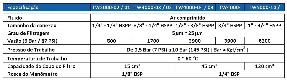 | TW5000-10D | FILTRO REGULADOR (1) – PROTETOR METÁLICO + DRENO AUTOMÁTICO |